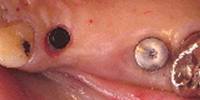 通常インプラント手術は、メスで歯肉を切開し骨を露出した後に、ドリルにて穴を開けてインプラントを埋入します。しかしこのフラップレステクニックは、メスを使わずほんの小さな穴を開けて手術を行います。